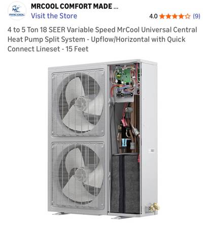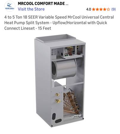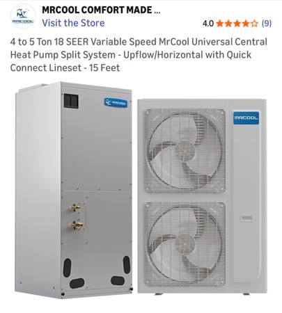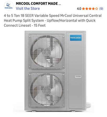 New, never installed, 4-5 Ton AC Heat Unit Precharged System with 15' Precharged Line Set, 18 Seer Unit, Dual Fan Unit on pallet ready to load.