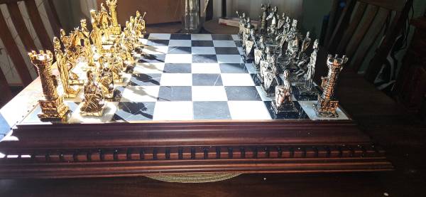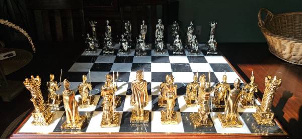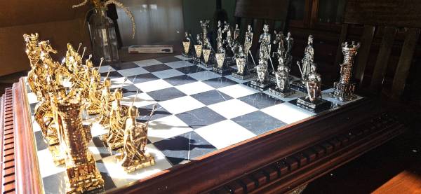 Stunning luxury marble chess set with gold-plated and silver-plated metal pieces, originally purchased from a fine art gallery in Key West.