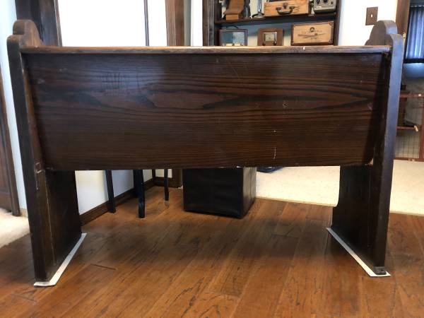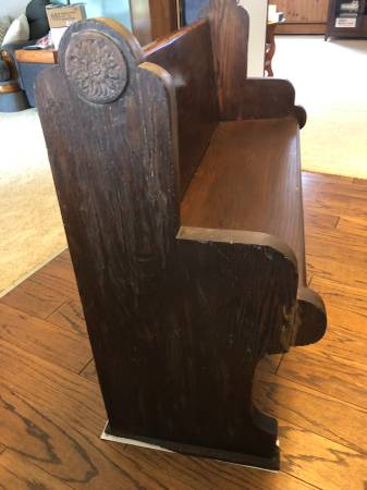 Old solid oak church pew. Small, 50" long, 36" high. Good condition except needs refinishing and cross is missing from side. $100.00 obo. Email, call or text, Seven0eight two1seven onesix9zero....
