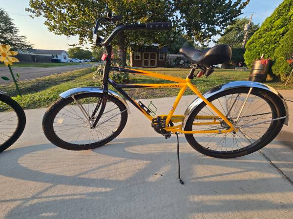 Pair of vintage 26" Schwinn single speed bicycles. The one shown on the left in the 1st photo is older than the other but both are still vintage. Some slight differences between the 2 even though most people always think they are exactly alike. The older one has been ridden by a 6 foot tall man. The other has been ridden by me and I am 5' 6". Due to our heights and leg length its very hard to find a bike that feels comfortable where we can stretch our legs out. These 2 bikes allow that and we have absolutely loved them!! Unfortunately we have motorcycles and antique cars now and just haven't been riding these like we use to. They have just sat in our garage since last spring so we have decided to part with them. Tires do hold air as should and were still inflated after all of that time. I believe I still have another Schwinn seat somewhere around here and IF I find it the new owner can have it too. Buyer must take both bikes however as we do not choose to sell separately. When we ride we both go. We dont choose for just one of us to have a bike should the urge to ride again surface. We are offering both bikes together for $500 and thats a lot less than 1 had originally cost us. These are collector bikes that are fully functional. Mt Vernon IL pick up