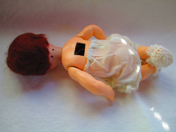 This was my Grandmother's baby doll, circa 1920's; in the 1960's she had a new body placed on the original head which is stamped with markings I cannot read (German I believe). Clothing (6 pieces) was made for the doll at that same time consisting of pantaloons, petticoat, dress & bonnet (all of linen with lace trim), and two hand crocheted booties. Hair may or may not be original. Eyes open & close when changing doll's position. Doll is 15" long, jointed & weighs 2 pounds.