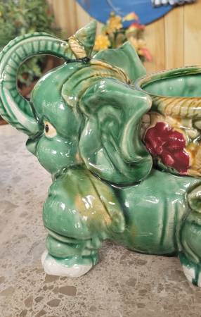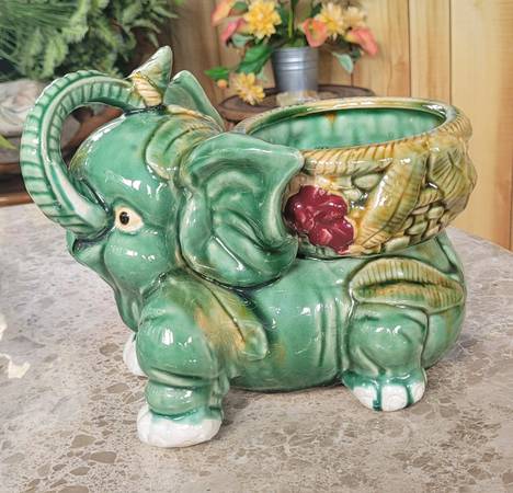 Very old elephant planter. My mom just had an artificial plant in it so it's very clean and in great condition. 8" tall x 10-1/2" long x 7" wide. It's in great condition ..there isn't even any crazing in the clear glaze as so many older pieces get. $50 Mt Vernon IL pick up