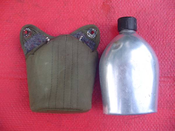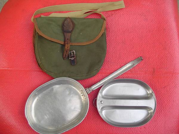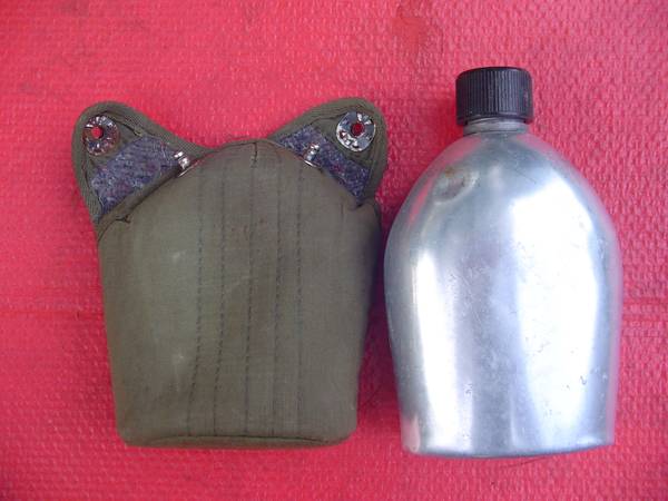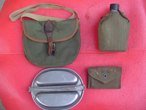 This listing is for Army surplus that has been in my family for years. I believe it was acquired during WWII and Korea conflict. The mess kit has stamped on it - US RIA 1918. The canteen has stamped on the bottom "Japan." The mess kit's carry is in excellent untorn condition with the leather strap and bucket still good working condition. The canteen's cover is also in very good untorn condition, both inside and out, with both snaps still fully functional.