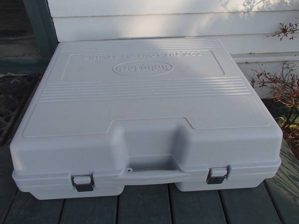 This is a very heavy duty sewing machine box that can not only be used for a sewing machine but everything else. It has a place for that a padlock can be used and so it would work well to lock up weapons for anything valuable. It measures 25" x 23".