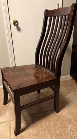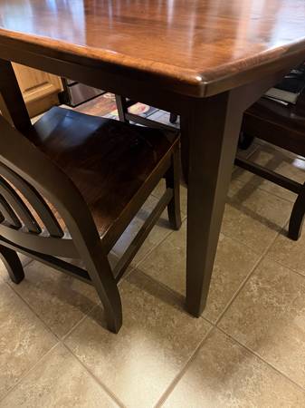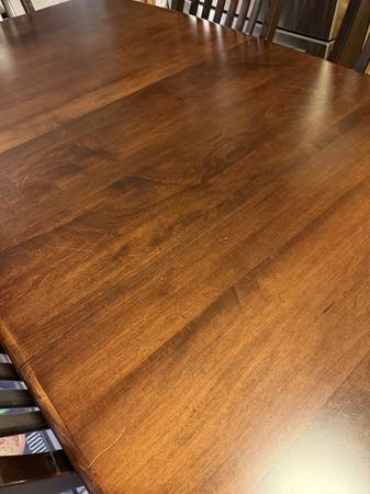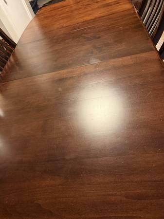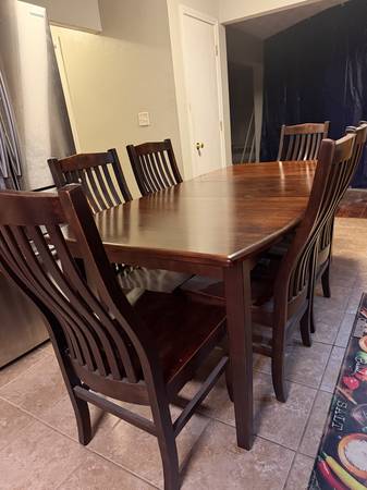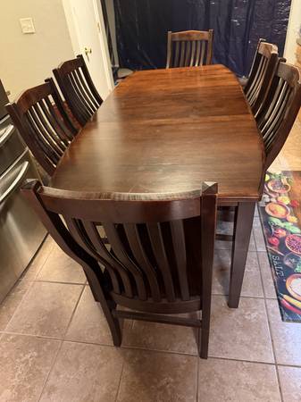 Dark wood dining table and chairs for sale. Has 2 removable leaves. You'll need to pick up on your own. Cash only at pickup. Text 6-0ne-8319-zero-four-29 if interested. Thanks