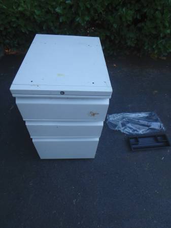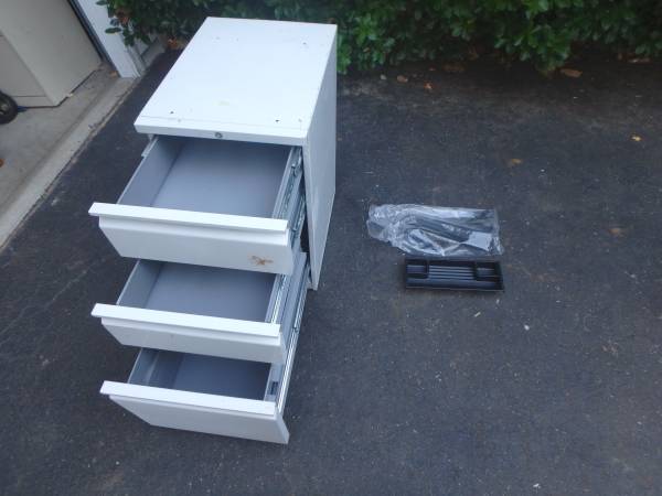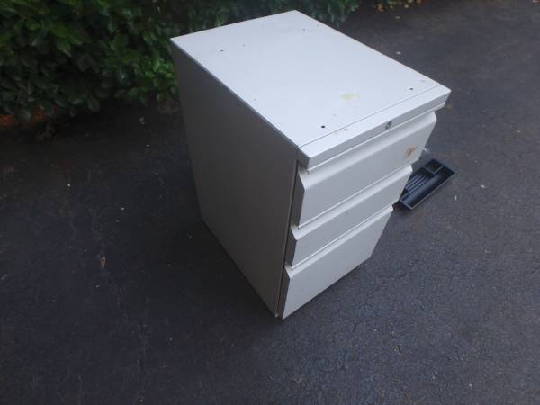 This is a nice 3 drawer locking file cabinet that can fit under an office desk. It can hold letter and legal papers and the drawers open easily. There is no key and measures 15" wide, 20" deep, and 27" tall.