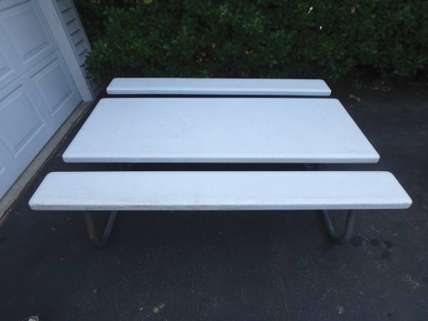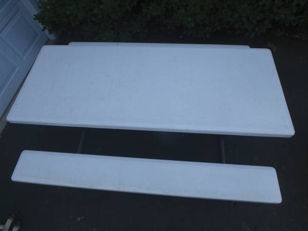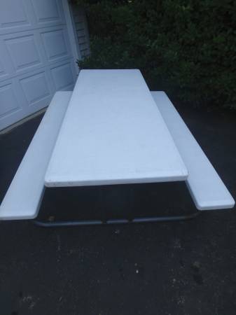 This is a nice 6 foot heavy duty plastic and metal picnic table that folds down for easy storage or transportation. It would work great at home for a party or family get together or take it to a camping trip or a BBQ outing. It measures 72" long, 55" wide, and 29" tall.