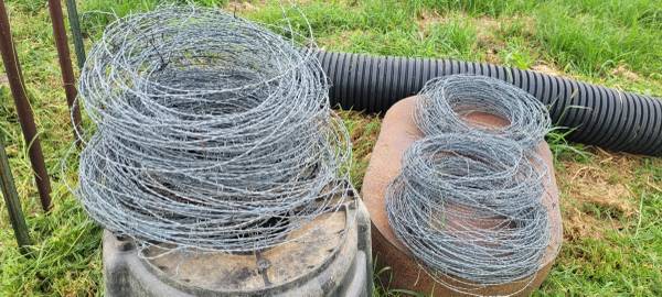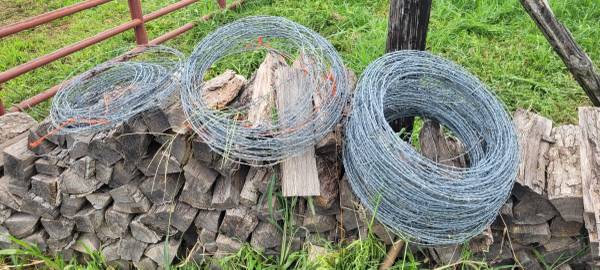 Lots of rolls of rust free barbed wire. I don't know total length but this was enough to go around my 2 acre pasture twice.