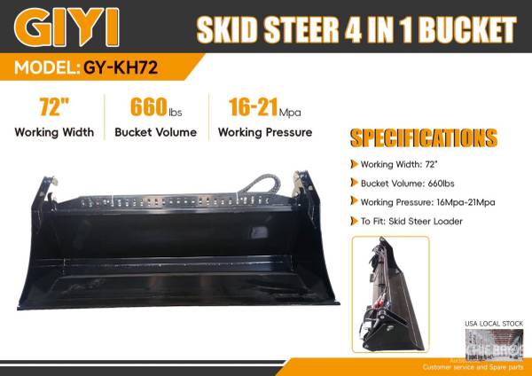 For sale, I have a brand new 72” GiYi model GIYI 72" GY-KH72F BUCKET FOR SKID STEER 4 in 1 skid steer bucket. This is the current quick attach system. This is brand new hydraulically operated bucket. It is ready to hook up and be put to work comes with hoses and fittings already on it. Delivery is available for a fee. Message me with any questions on it. Located in Thompsonville, Illinois 62890.