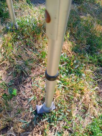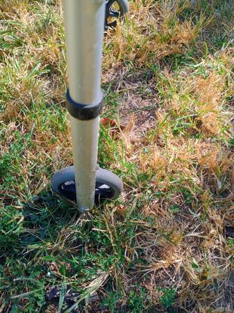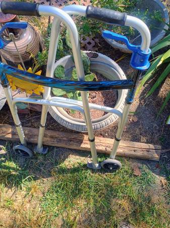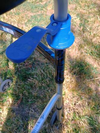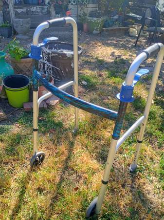 Made by Drive Medical. Aluminum alloy with back stops,these allow for safe usage on carpet, sidewalks and uneven terrain. This is the heavy duty model 21 inches wide x 36 inches tall (; adjustable to 44 inches).It does have a few scrapes from transportation ,nothing major. Easy push button fold up for folding it up. Has a black and blue racing flame motif. See pics. For quicker response you may text show contact info