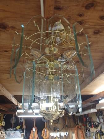 This is a nice working Eava chandelier with 2 tier of lights and glass shades. It comes with the “antique” looking light bulbs and comes with a couple of extra ones.