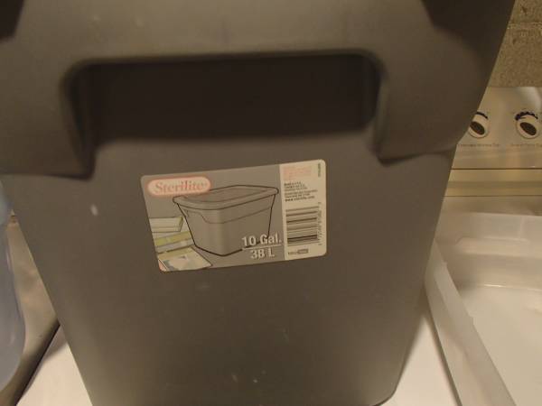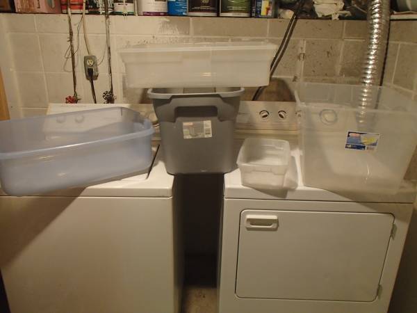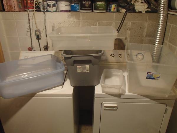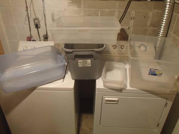 These are 5 plastic storage containers for any household storage needs. No lids and all for $15.00.