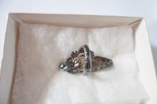 Antique Art Nouveau sterling silver ring lady and child with flowing swirls flowers. I believe it is about a size 4 -5. Inside is marked Sterling with a picture of standing lion, a crest with R, and and a figure of something, may be eagle or head. Some letters are marked after the markings. I cannot see what they are. Also marked Pat Apld For inside. Weighs 8.5 gm.
