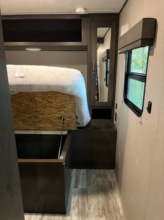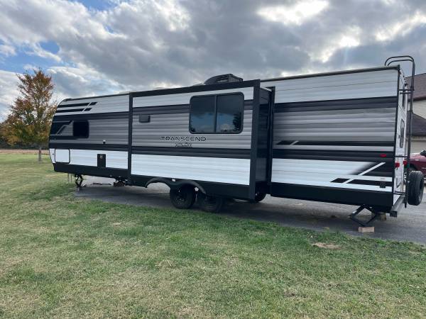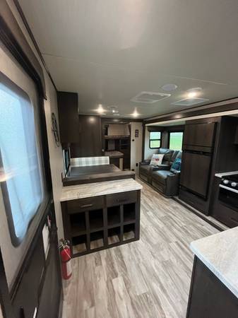 This camper is great for families! Sleeps 8-10! SUPER CLEAN! Well maintained and not used much which is why we are selling. Private master bedroom with queen bed in front and private bunkhouse in rear with two twin beds above a double bed. Dinette converts into another bed and there are two comfy recliners. Beautiful kitchen with 3‑burner stove, oven, microwave, a mid‑size 12V refrigerator. Also has an outside kitchen with a small refrigerator, cooktop, and an LP quick‑connect. There is tons of storage in this camper! Construction built for use in any season, heated & enclosed underbelly, suspended tanks, good insulation (roof, walls, floor), moisture barrier. A 20 ft power awning. Exterior spray port, black tank flush system. Power tongue jack for easier hitching/unhitching. This is really a beautiful camper!