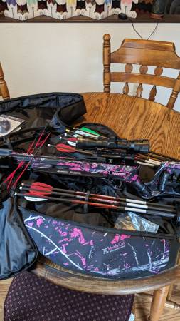 Lady Ranger Crossbow with case and bolts. Maybe shot 5 times at a target. Never hunted with. Like New.