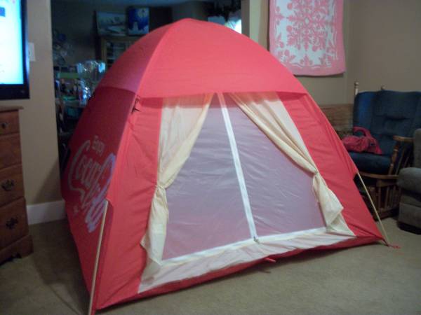 Branded with "Coca Cola" insignia on both sides. It may have been a promotional item. Floor measures 72 inches wide by 78 inches deep. Interior height is 50 inches. No holes, rips or tears, Appears to never been used. Fiberglass poles. Cash only. Please call or email. No texts. Thanks.