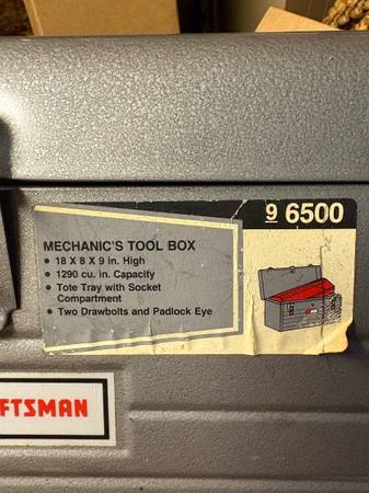 Craftsman steel mechanics tool box. 1,290 cubic inch capacity with two draw bolts and padlock eye.