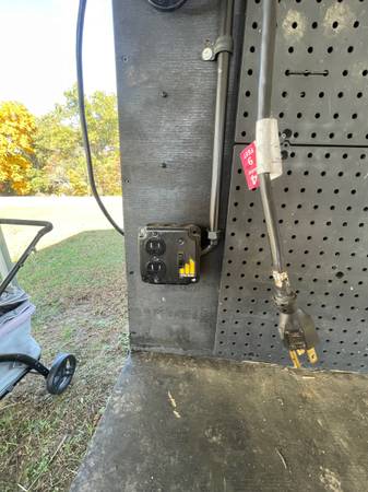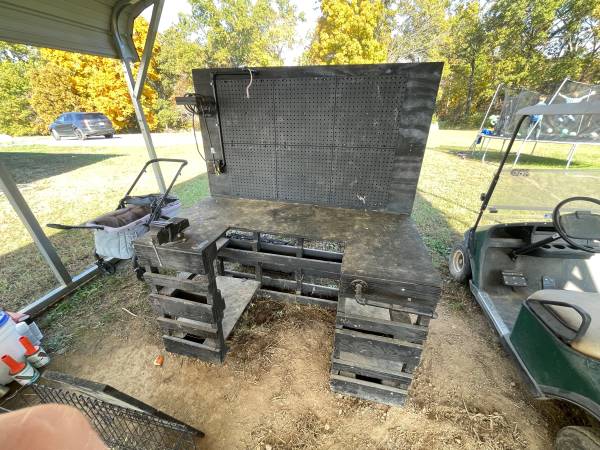 Pallet tool bench with vise and dual outlet with switch. Pre wired to plug in to outlet and also pre wired for shop light on top of work bench. Call or text . Asking $250 obo